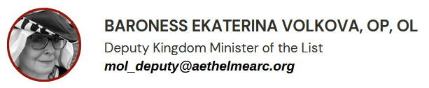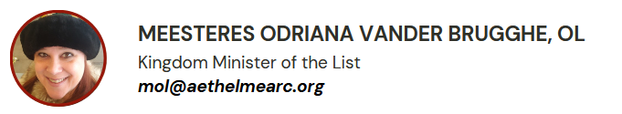 This is the recognized website for the Kingdom of Æthelmearc Minister of the List of the Society for Creative Anachronism, Inc. and is maintained by Meesteres Odriana vander Brugghe. This site may contain electronic versions of the group’s governing documents. Any discrepancies between the electronic version of any information on this site and the printed version that is available from the originating office will be decided in favor of the printed version.