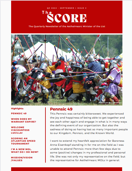 This is the recognized website for the Kingdom of Æthelmearc Minister of the List of the Society for Creative Anachronism, Inc. and is maintained by Meesteres Odriana vander Brugghe. This site may contain electronic versions of the group’s governing documents. Any discrepancies between the electronic version of any information on this site and the printed version that is available from the originating office will be decided in favor of the printed version.